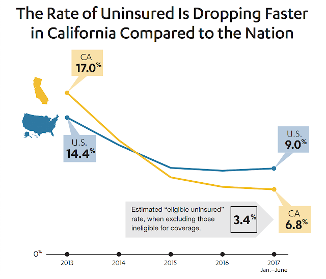 - California’s uninsured rate dropped to 6.8 percent in first six months of 2017, down from 17 percent in 2013 — a new record low.