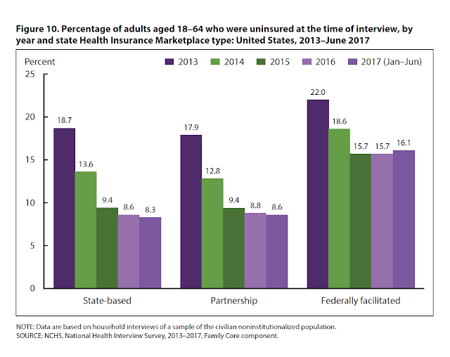 In addition, in the first half of 2017, state-based marketplaces continued to make progress at reducing the number of the uninsured, from a rate of 8.6 percent to 8.3 percent. This same period marks the first time since 2014 that the rate of the uninsured increased in states supported by the federal marketplace.
